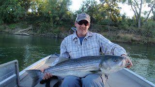 Spent most of the time fishing about a 300 yard bank that had carp, stripers, salmon, and pike minnows all rolling, rising, or smashing bait...it was cool. Caught a few small stripers and had one big mo follow me all the way to the boat fishing an I line...Heart about beat out my chest I saw this thing follow my fly for like 70 feet and turn off right at the boat. Fishing wasn't great but it was a gorgeous day and I did catch some fish. Still some big fish around and eating. Here is a pic from a buddy of mine this last week with a nice fish
